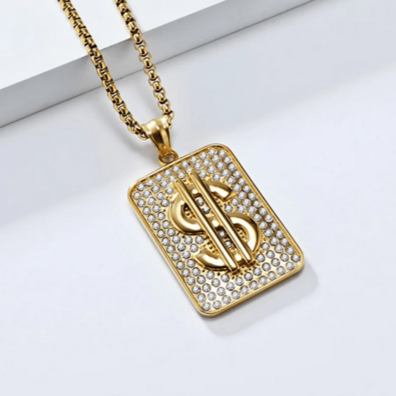 US Dollar Dog Tag Pendant Iced Out Bling Gold Plated Money Sign Rich Hip Hop Collar Chain Necklace